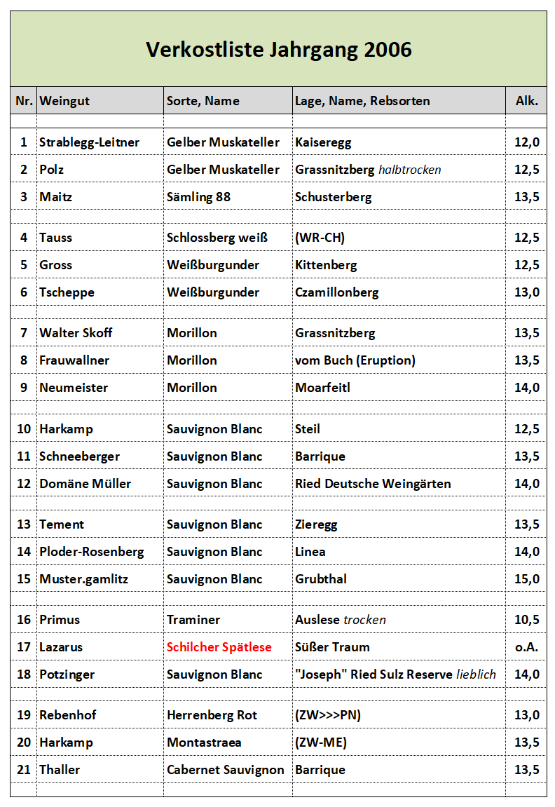 Was: Weine von Gross, Harkamp, E. & W. Polz, Prünte, Sattlerhof, Schloss Seggau, Tement, Günther Wagner und Wohlmuth sowie Neumeister, Thaller und Winkler-Hermaden.