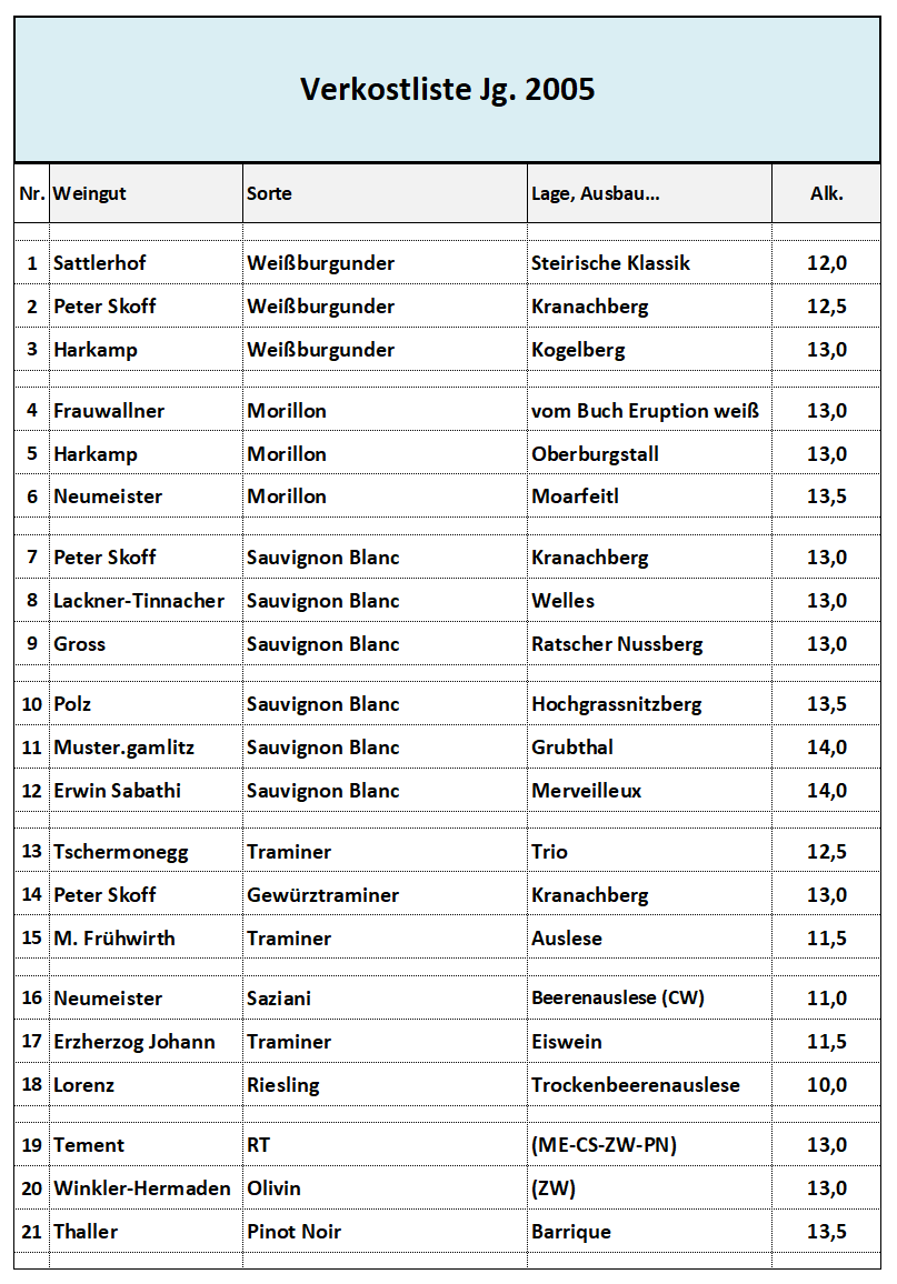 Was: Weine (voraussichtlich) von Gross, Harkamp, Maitz, Domäne Müller, Muster-Gamlitz, E. & W. Polz, Potzinger, Primus, Rebenhof, Erwin Sabathi, Schneeberger, Walter Skoff, Strablegg-Leitner, Tauss, Tement, Andreas Tscheppe, Tscheppe (am Pössnitzberg) sowie Frauwallner, Neumeister, Ploder-Rosenberg, Thaller und Winkler-Hermaden als auch Jöbstl (Wernersdorf).